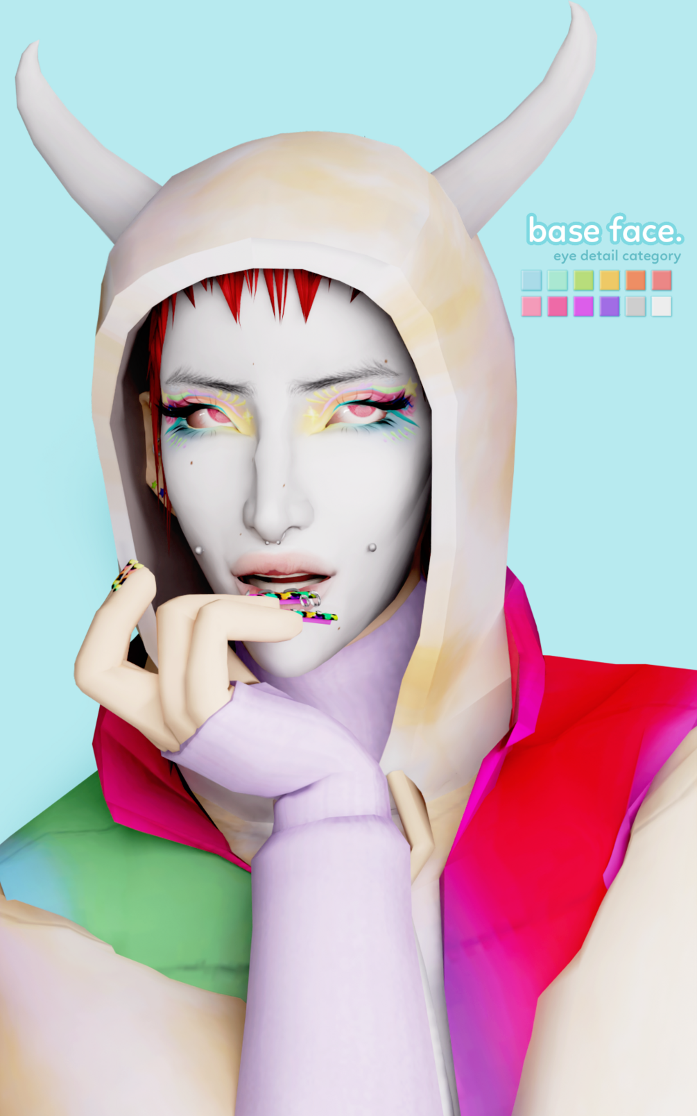 12 swatches, BGC, HQ comp, and for fem & masc (painted on a fem reference). found in the eye detail category & works with MOST makeup - older makeup may not appear. mostly a rework of our older white face base.
