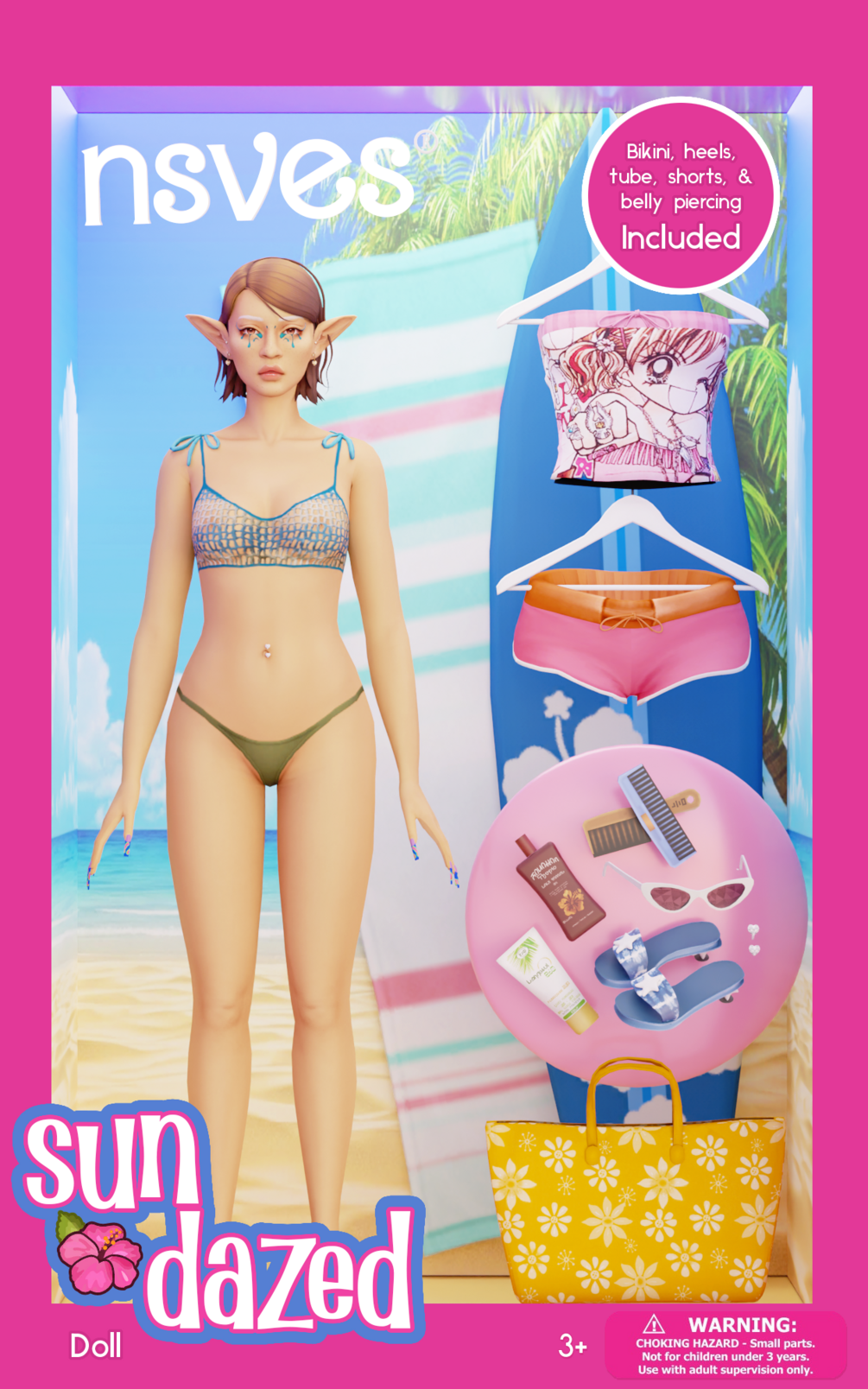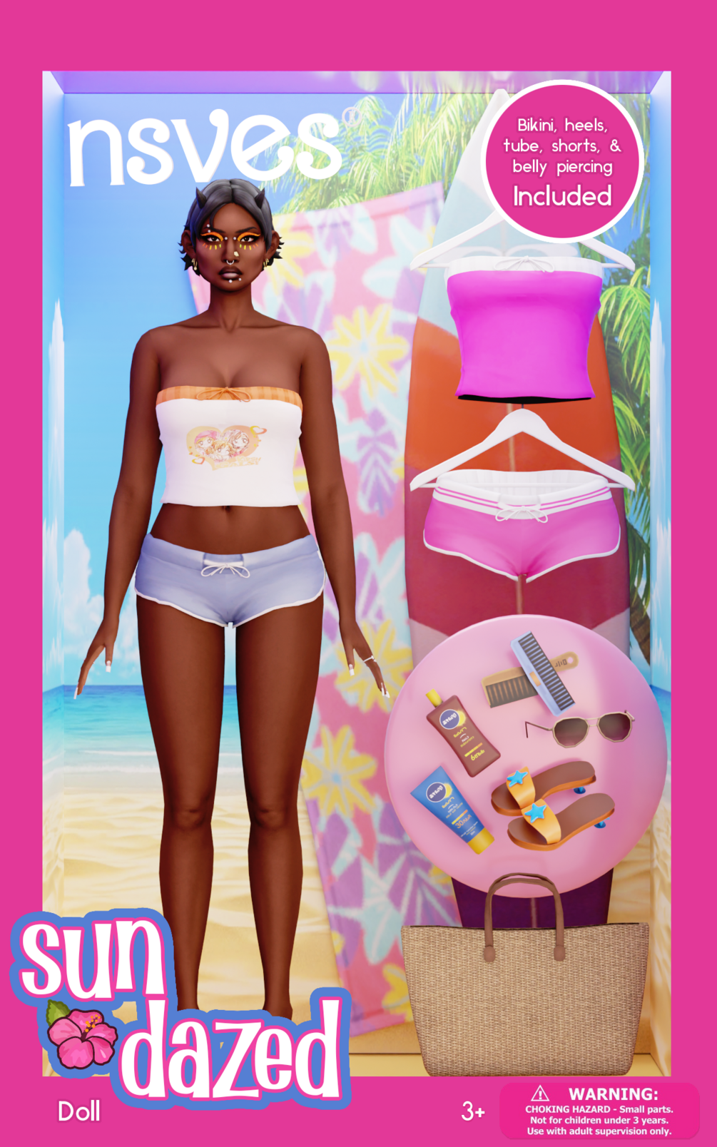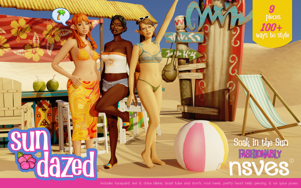 includes facepaint, lexi & chloe bikinis, brazil tube and shorts, mori heels, pretty heart belly piercing, and ice spice poses (in game & clumsy trait). all but the bikinis are HQ compatible, BGC, and all custom thumbnails